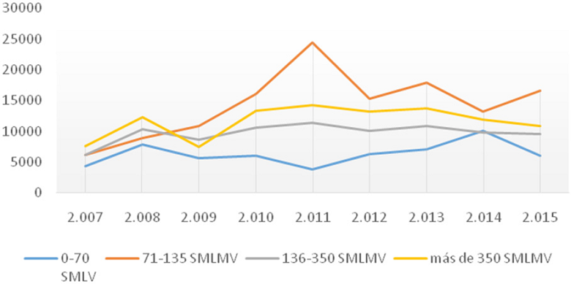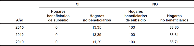 Se utilizaron los resultados de la encuesta de calidad de vida del DANE, aplicada en tres años diferentes (2010, 2012 y 2015) y el factor de expansión10 para hacer inferencias sobre el número total de hogares que tienen un ingreso menor a 4 salarios mínimos legales vigentes, diferenciando a aquellos que han sido beneficiarios de la política durante los dos años anteriores a la aplicación de la encuesta, y aquellos que no lo han sido.