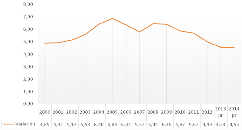 La participación del sector de la construcción en el PIB, el crecimiento ha sido sostenido, con variaciones que van entre el 4,53 y el 6,86. Los mayores incrementos se dan entre el 2004 (6,40) y el 2009 (6,40), los cuales pueden relacionarse directamente con la implementación del microcrédito inmobiliario y la creación del Fondo Nacional de Vivienda, en el periodo presidencial de Álvaro Uribe.