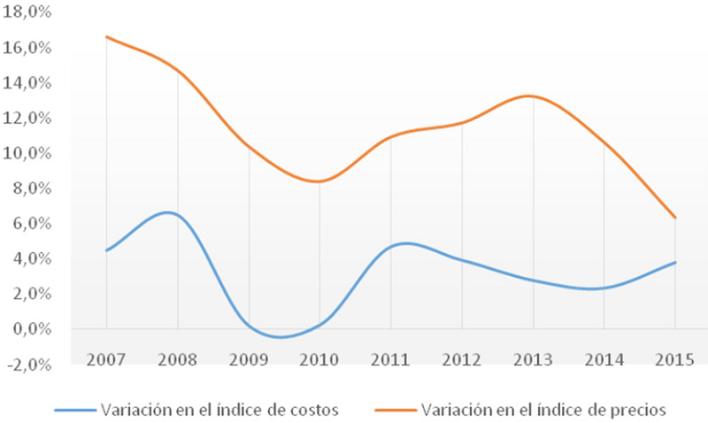 Durante el periodo comprendido entre los años 2008 y 2011, se refleja un comportamiento casi proporcional entre la variación del índice de costos y el índice de precios de vivienda nueva en Bogotá; sin embargo a partir del año 2012 se evidencia un crecimiento en mayor proporción del índice de precios con relación al índice de costos. Esto muestra una problemática en la elevación de precios que incide directamente en la oferta de vivienda de interés social y en la capacidad de la población más vulnerable para asumir los requisitos de esta nueva oferta.