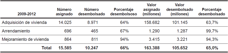 Dado que el desembolso del subsidio está supeditado a la aprobación del crédito hipotecario, y la aprobación del crédito al ingreso del hogar y la capacidad de endeudamiento, esta relación es evidente. De esta manera, se identificó que poseer las condiciones de vulnerabilidad establecidas en el modelo, no garantiza una mayor probabilidad en la tenencia de vivienda; de allí que entre el año 2009 y 2012 sólo se haya efectuado una asignación de subsidios para VIP, correspondiente al 10,24% de la producción total de VIS.