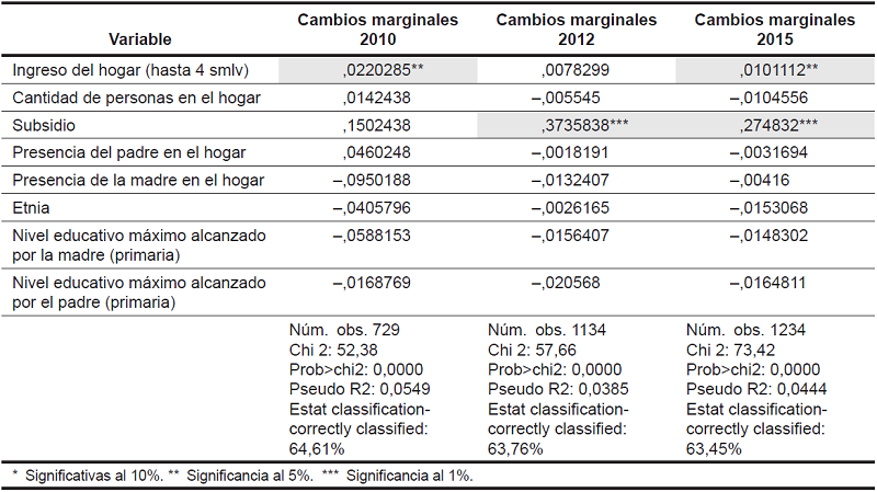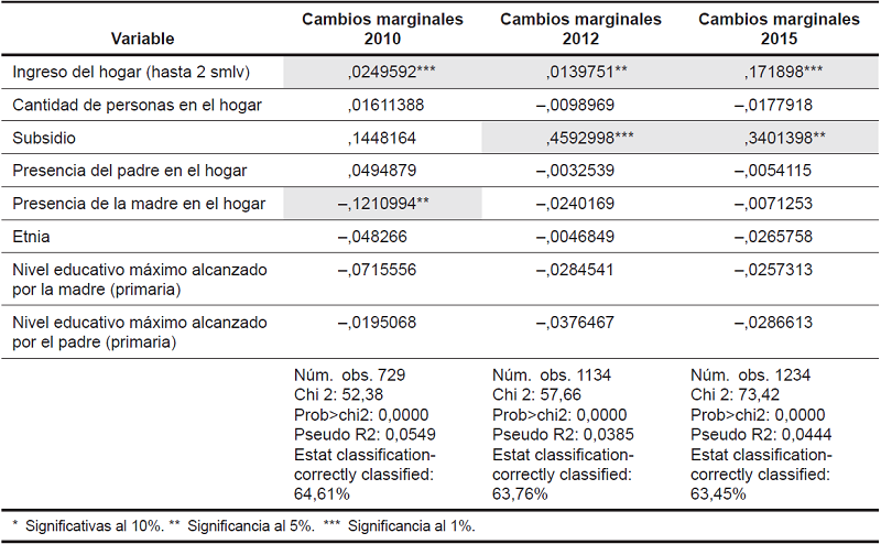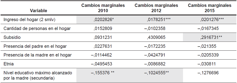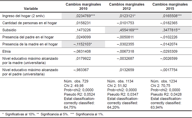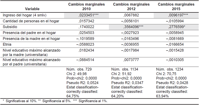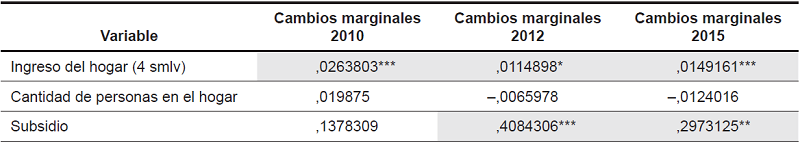Los hogares beneficiaros de subsidio de vivienda aumentaron la probabilidad de tenencia en un 40,84% en el año 2012 y 29.73% en el año 2015, frente a los que no accedieron a él. Igualmente, el hecho de que la madre sólo posea estudios secundarios, hace que la probabilidad de tenencia en el hogar descienda en un 16,81% en el 2010 y en un 8,451% en el 2015, frente e a los hogares en los que la madre posee niveles educativos más altos.
