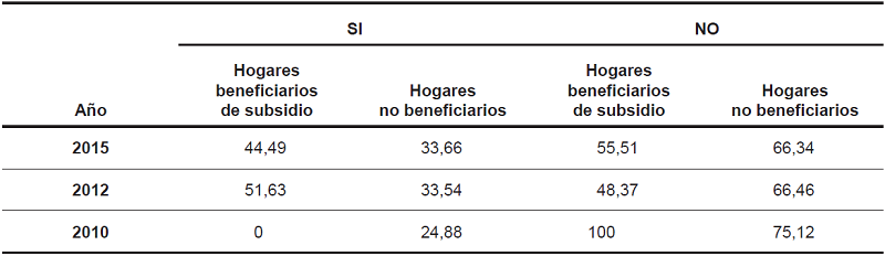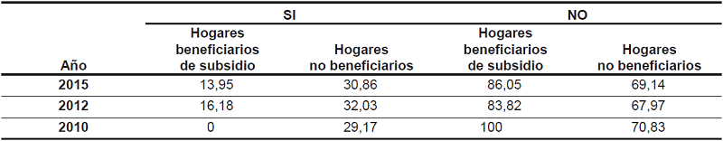 Igualmente los hogares que accedieron al subsidio aumentaron la probabilidad de tenencia de vivienda en un 37,35% en el año 2012 y 27,48% en el año 2015, frente a quienes no fueron beneficiarios.
