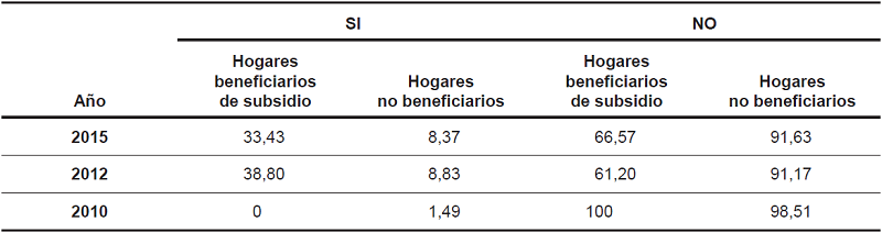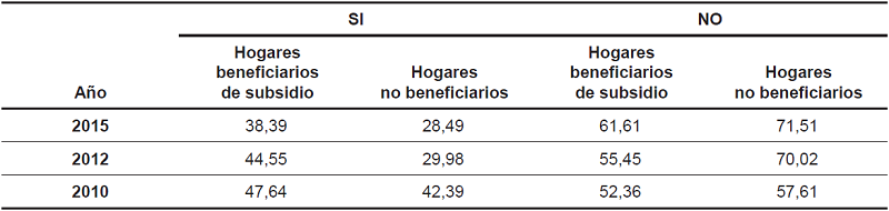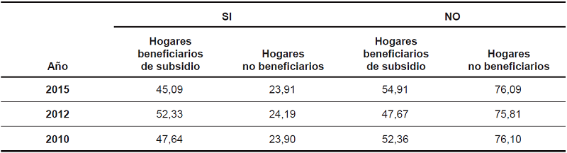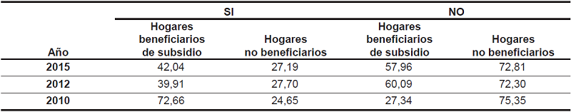 Igualmente, ser beneficiario del subsidio de vivienda aumentó la probabilidad de tenencia en un 35,64% y 27,76%, durante los años 2012 y 2015, respecto a los hogares que no recibieron subsidio.