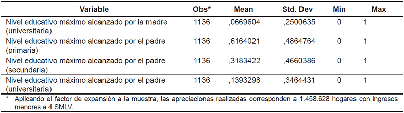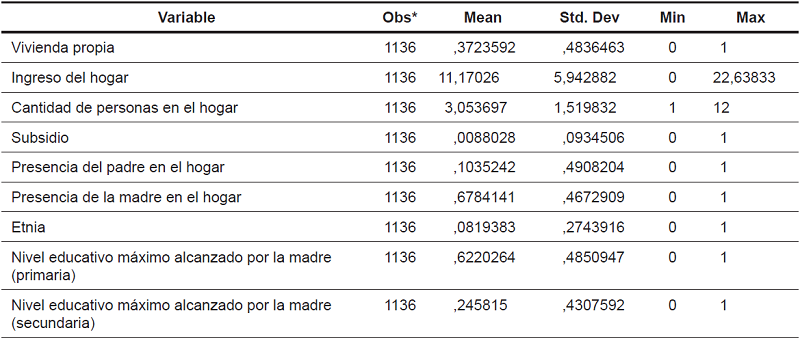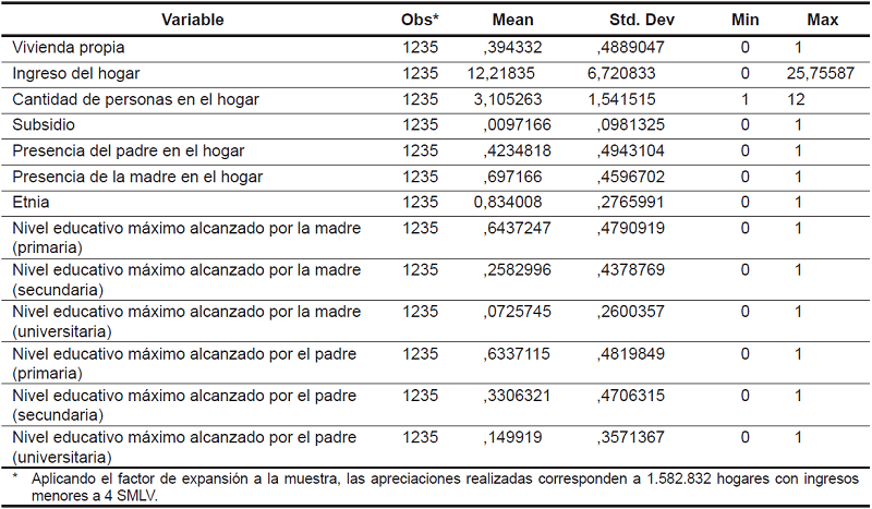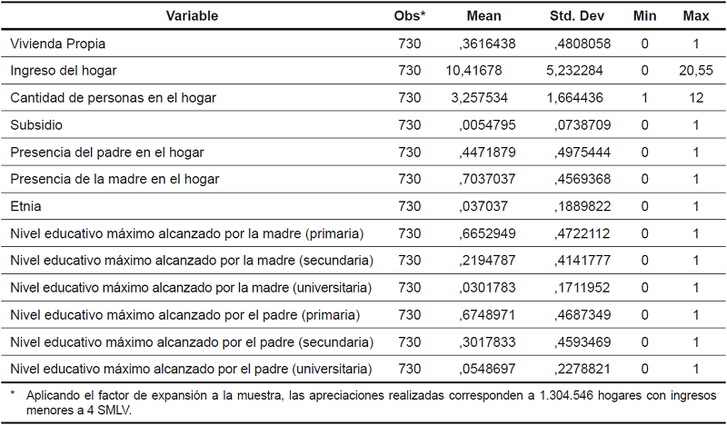 En coherencia con lo anterior, se extrajeron de la encuesta de calidad de vida (años) la información referente a las variables: ingreso del hogar (en pesos colombianos), cantidad de personas que componen el hogar (número de personas), subsidio8 (var. dummy: 1 sí el hogar fue beneficiario, 0 en caso que no), presencia del padre en el hogar (var. dummy: 1 si el padre convive en el hogar, 0 en caso que no), presencia de la madre (var. dummy: 1 si la madre convive en el hogar, 0 en caso que no), etnia (var. dummy: 1 si existe algún miembro del hogar perteneciente a algún grupo étnico, 0 en caso que no), nivel educativo máximo alcanzado por la madre (var. dummy: 1 según corresponda, primaria completa o incompleta, secundaria completa o incompleta, y superior completa o incompleta, y 0 en caso de no contar con ninguno de los niveles de formación establecidos), nivel educativo máximo alcanzado por el padre (var. dummy: 1 según corresponda, primaria completa o incompleta, secundaria completa o incompleta, y superior completa o incompleta, y 0 en caso de no contar con ninguno de los niveles de formación establecidos). Así mismo, se realizó la comparación de tres años (2010, 2012 y 2015), con el fin de identificar la incidencia del modelo de vulnerabilidad en la tenencia de vivienda y efectos de mejora en la población objeto, así: