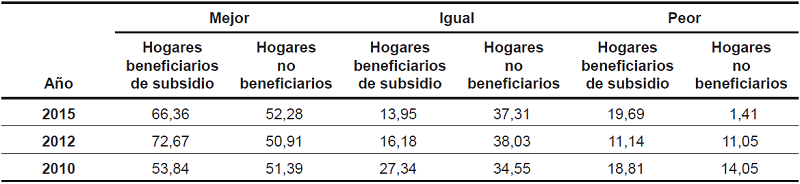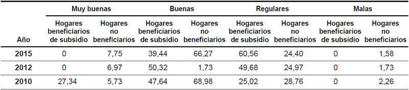 En cuanto a las condiciones de los hogares, se evidencian diferencias significativas entre los dos grupos poblacionales. La percepción en aquellos que han sido beneficiarios de la política ha ido focalizándose y aumentando en el concepto «regular», pasando de una frecuencia del 25% en el 2010 al 60,56% en el 2015. Las razones por las cuales los hogares realizan este juicio son desconocidas, por lo cual la indagación sobre este aspecto será uno de los retos de la política.
