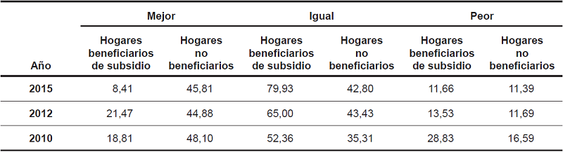 4. Percepción del nivel de la calidad de vida:Finalmente, atendiendo a la concepción de Currie sobre el bienestar y su asociación al nivel de satisfacción de los individuos, se realizó un análisis de la apreciación del grupo poblacional de la política, diferenciando a aquellos que han sido beneficiarios, sobre el mejoramiento de sus condiciones de vida, a partir de los resultados de la encuesta aplicada por el DANE en los años 2010, 2012 y 2015.