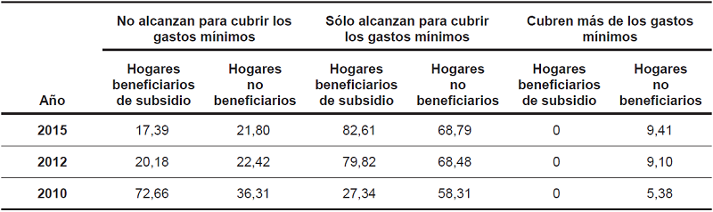 La percepción de los hogares beneficiarios indica que los ingresos sólo alcanzan para cubrir los gastos mínimos del hogar. La frecuencia con la que los hogares manifiestan esta apreciación ha aumentado significativamente en los últimos años, pasando de 27,34% en el 2010 a 82,61% en el 2015. Al comparar los dos grupos poblaciones, se identifica nuevamente que el nivel de satisfacción en los hogares benefeciarios, con relación a este aspecto, es menor.