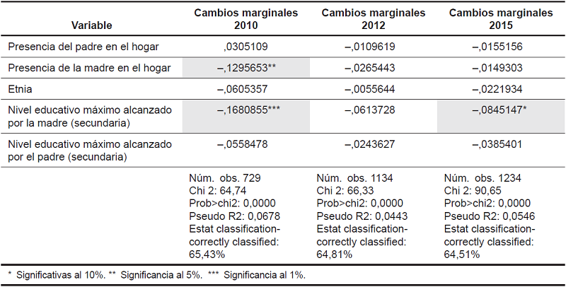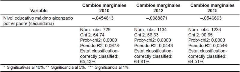 Cuando la madre sólo posee estudios secundarios, la probabilidad de tenencia en el hogar descendió un 15,54% en el 2010 y un 10,24% en el 2015, frente e a los hogares en los que la madre posee niveles educativos más altos.