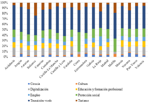 En esta tabla podemos observar que, a 31 de diciembre de 2021, las transferencias aprobadas en las conferencias sectoriales (8.831 millones de euros), y los convenios o concesiones a las CC.AA (2.415 millones), ascendían en conjunto a 11.246 millones de euros corrientes22. Es decir, del total de 24.198 millones de euros correspondientes al MRR en 2021, aproximadamente el 45 % (11.246), ha sido asignado a las administraciones regionales, al final de dicho año. Por áreas de inversión, este importe se ha dedicado a políticas públicas vinculadas a la transición ecológica, la digitalización, la protección social, la educación y formación profesional, el turismo sostenible, el empleo y la ciencia (Cantalapiedra y Domínguez, 2021). De entre estas áreas o capítulos destaca ampliamente en todos los territorios lo destinado a transición verde o ecológica(Gobierno de España, 2021b). Puesto que se trata de inversiones correspondientes a políticas incluidas en el PRTR, cada uno de los capítulos atiende a una serie de ítems predeterminados. En el caso de la transición ecológica a: restauración de ecosistemas y biodiversidad, energías renovables, movilidad sostenible, rehabilitación energética de edificios y transición justa.