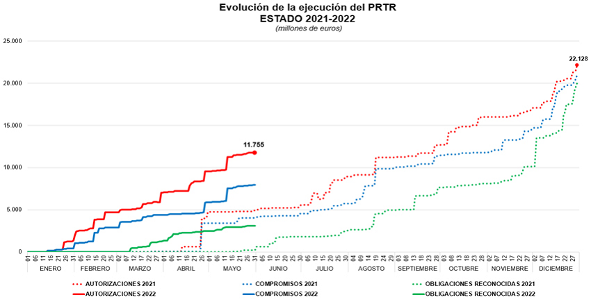 Desde el punto de vista del avance en la ejecución del PRTR y, por tanto, de los desembolsos llevados a cabo, España recibió en julio de 2021 el visto bueno final del Ecofin, lo que facilitó ‒tras una prefinanciación de 9.000 millones durante el mes de agosto para comenzar a andar, y algunas trabas iniciales (Sérvulo y Gutiérrez, 2021)‒ que obtuviera el 27 de diciembre de 2021 un primer pago definitivo de 10.000 millones de euros23. El segundo desembolso, de 12.000 millones, ya ha sido respaldado por la Comisión Europea –27 de junio de 2022– tras considerar que se han cumplido los 40 hitos y objetivos correspondientes a esta fase24. Por otra parte, aunque la ejecución de las inversiones previstas en el Plan se extienda hasta 2026, un 70 % del MRR debe estar comprometido en el período 2021-2023, de ahí que quede poco tiempo –pese al anuncio de este segundo desembolso– y bastante incertidumbre sobre la realización de unos compromisos de tal magnitud.