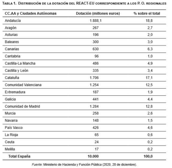 En España, de los 12.436 millones de euros que le corresponden a esta iniciativa, 2.436 son gestionados por el Estado (Programa Operativo – P. O.- plurirregional). Y el resto, 10.000 millones, por las CC.AA a través de los P. O. ya existentes del Fondo Social Europeo (FSE) y del Fondo Europeo de Desarrollo Regional (FEDER), añadiéndoles un nuevo eje a los mismos. Luego la distribución del 80 % del paquete REACT-EU, los 10.000 millones de euros, entre las CC.AA queda en términos absolutos y porcentuales como se recoge en la Tabla 1 adjunta. Según esta tabla, Andalucía (18,8 %), Cataluña (17,1 %), la Comunidad de Madrid (12,8 %) y la Comunidad Valenciana (12,5 %) son las que más cuantía reciben, acumulando de forma conjunta más del 60 % del total.