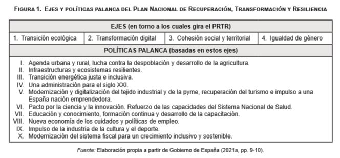 Para la consecución de estos objetivos, cuatro son los ejes en torno a los cuales pivota dicho Plan: la transición ecológica, la transformación digital, la cohesión social y territorial, y la igualdad de género. Y diez, las diversas «políticas palanca» que se orientan en ellos y determinan el camino a seguir. Estas son: la agenda urbana y rural, la lucha contra la despoblación y el desarrollo de la agricultura; la resiliencia de infraestructuras y ecosistemas; la transición energética justa; la modernización y digitalización de las administraciones públicas, del tejido industrial y de la pyme, así como la recuperación del turismo; la apuesta decidida por la ciencia y el refuerzo del Sistema Nacional de Salud; el impulso a la educación y la formación profesional continua; el desarrollo de la nueva economía de los cuidados y las nuevas políticas públicas de empleo; el estímulo a la industria de la cultura y el deporte; y, la modernización y fortalecimiento del sistema fiscal (y de pensiones) para un crecimiento inclusivo y sostenible (véase, Figura 1).