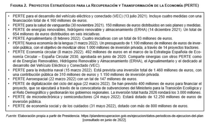 En el segundo semestre de 2022, el Gobierno prevé realizar convocatorias vinculadas, entre otras cuestiones, a la digitalización de pequeñas empresas, microempresas y autónomos; inversiones en equipos de alta tecnología para hospitales; ayudas para la mejora de la competitividad, sostenibilidad y trazabilidad de la industria agroalimentaria y de la seguridad alimentaria; subvenciones para el fomento de la economía circular en el ámbito de la empresa; e inversiones en cercanías y red de ferrocarril. A estas hay que sumar las convocatorias y licitaciones, tanto de programas generales a nivel nacional como de los PERTES. Las primeras, gestionadas por el Estado, se agrupan en ocho planes complementarios: biotecnología aplicada a la salud, ciencias marinas, comunicación cuántica, energía e hidrógeno renovable, agroalimentación, astrofísica y física de altas energías, biodiversidad, y materiales avanzados. Y en el caso de los PERTES (véase Figura 2 en anexo), con una asignación de más de 30.000 millones de euros, incorporan un conjunto de proyectos transnacionales, que incluyen una creciente colaboración con Portugal en los ámbitos de transición energética, digitalización e industria aeroespacial; además de apuntar a un potencial transformador de la economía a tener en cuenta, a medida que se vayan consolidando.