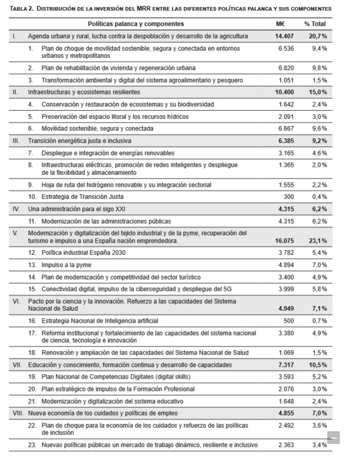 Desde el punto de vista cuantitativo, y teniendo en cuenta que el PRTR se centra fundamentalmente en la primera fase de ejecución de las inversiones y reformas (2021-2023), y, concretamente, en las que se financian con los casi 70.000 millones del MRR, en la Tabla 2 se recoge la distribución prevista de la cuantía de este fondo entre las diferentes políticas palanca y sus componentes. En ella observamos, a grandes rasgos, una concentración importante de la inversión en los ámbitos de la transformación verde (más del 40 % del total, que incluye, de forma aproximada, las tres primeras políticas palanca y sus componentes) y digital (un 29 %, donde se tiene en cuenta la modernización y digitalización de las administraciones públicas y el tejido industrial, principalmente). A estos ámbitos, les sigue la inversión en educación y formación (10,5 %), ciencia e innovación (I +D +i), con especial detenimiento en la relativa al Sistema Nacional de Salud (sobre un 7 %), y apoyo a la inclusión social y la cohesión en todo el territorio nacional (7 %). En este último caso, a través de un plan de choque para la economía de los cuidados y un refuerzo de las políticas de inclusión, junto con las nuevas políticas públicas del mercado de trabajo. Finalmente, un 1,2 % de la inversión lo representa el impulso a la industria de la cultura y el deporte.