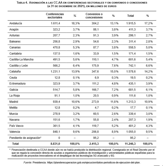 El reparto de fondos presupuestados se realiza mediante varios mecanismos (conferencias sectoriales, convenios, concesiones directas o concurrencia competitiva, etc.) entre los que destacan las conferencias sectoriales, 59 celebradas durante 2021 (véase Tabla 3, Anexo). Según el Gobierno de España (2021b, p. 1), «las asignaciones se realizan de acuerdo con los criterios objetivos de distribución fijados por las respectivas conferencias sectoriales y, por tanto, de manera consensuada». Luego son estas conferencias las que han permitido, a través de un permanente, y a veces costoso, proceso de diálogo entre los distintos ministerios y las administraciones territoriales, desde finales de 2020, acordar tanto la cantidad a transferir como los criterios de reparto a las CC.AAde dicha cantidad. No obstante, creemos importante hacer notar que estos criterios no son únicos, varían en función de cada uno de los proyectos asociados a las políticas palanca y los componentes del Plan21. Además, no podemos olvidar la necesidad última de cumplir hitos y objetivos por parte de los proyectos financiados por el MRR, ni el hecho de que todas las administraciones públicas implicadas lo deban tener presente. Dicho esto, el reparto de los fondos a las CC.AA para que ellas los gestionen –atendiendo a estos acuerdos alcanzados en las conferencias y consejos territoriales, y refrendados por el Consejo de Ministros– es el que se muestra en la Tabla 4 adjunta.