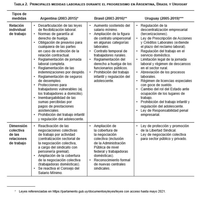 El cuadro que se presenta a continuación sintetiza las principales medidas laborales impulsadas durante los gobiernos progresistas en Argentina, Brasil y Uruguay.