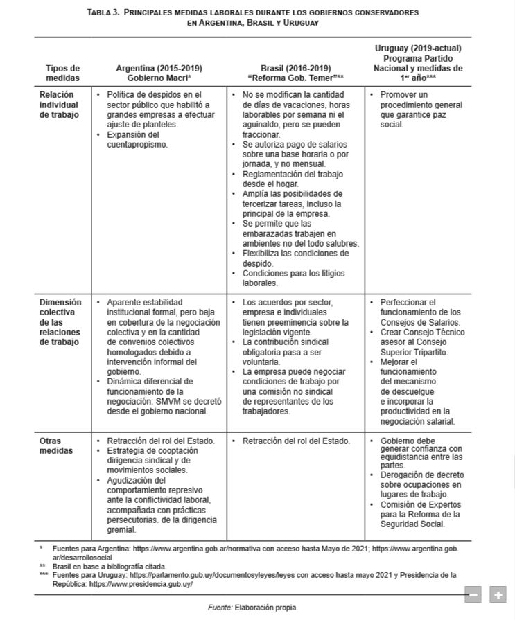 Como se puede apreciar, en este primer año de gobierno no se desmontó el esquema de relaciones laborales establecidos durante los gobiernos progresistas del FA, sin embargo, comienza a vislumbrarse un cambio en el papel del Estado en la política laboral. El cuadro que se presenta a continuación muestra, sintéticamente, las medidas reseñadas en esta sección para los tres países en el período de gobiernos conservadores.