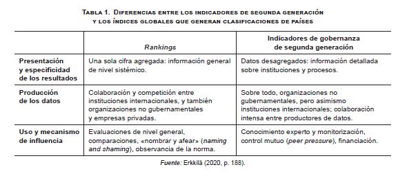 Así, desde el punto de vista de las personas docentes de materias de análisis de políticas, resulta forzoso enseñar a los estudiantes a examinar con cautela las definiciones y el proceso de producción tanto de los indicadores de gobernanza de segunda generación, centrados en distintos componentes de esta noción, como se detallará más adelante en este artículo, como de las clasificaciones generales de países, sobre todo, de aquellas que no distinguen entre áreas geográficas.