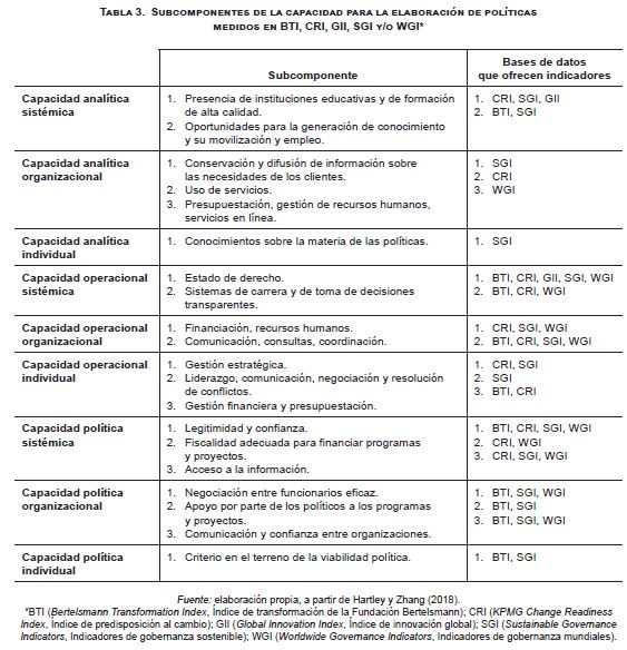 El asunto ha despertado la atención de autores como Hartley y Zhang (2018), quienes ponen el foco en la siguiente carencia. Mientras que la dimensión de la gobernanza relativa a la capacidad para la elaboración de políticas públicas (policy capacity) resulta clave por sus efectos socioeconómicos y políticos, muchas de las habilidades que incluye no se han considerado en la producción de los indicadores de gobernanza de uso más frecuente.