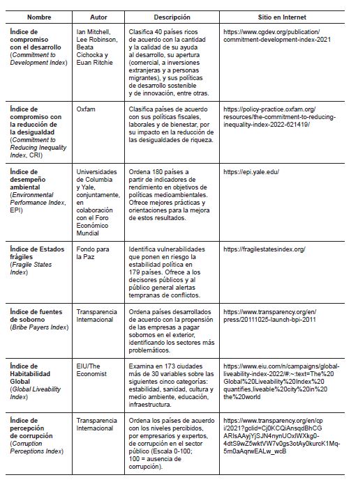 Índice de compromiso con el desarrollo (Commitment to Development Index). Clasifica 40 países ricos de acuerdo con la cantidad y la calidad de su ayuda al desarrollo, su apertura (comercial, a inversiones extranjeras y a personas migrantes), así como sus políticas de desarrollo sostenible y de innovación, entre otras. https://www.cgdev.org/publication/commitment-development-index-2021