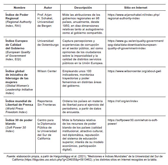 Índice 30 de poder blando (Soft Power 30 Index). Mide la fortaleza relativa de los recursos de poder blando de los países (calidad institucional, atractivo cultural, red diplomática, reputación del sistema de educación superior, interés de su modelo económico, participación digital). https://softpower30.com/what-is-soft-power/