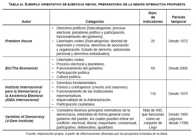 También se indica a los estudiantes que elaboren una tabla donde se recoja el período temporal para el que estos proyectos ofrecen datos sobre calidad de la democracia, las principales categorías que emplean en la operacionalización de este concepto abstracto y el número de indicadores que producen.
