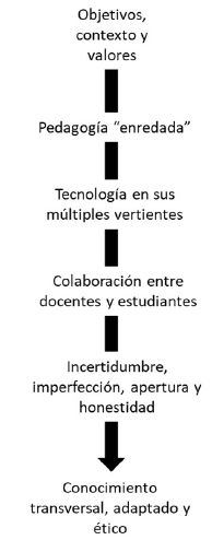 Al igual que Koehler, Mishra y Cain (2013) anteriormente, Fawns (2022) considera que el uso indiscriminado de herramientas tecnológicas no tiene sentido si carece de un objetivo final, no se adapta al contexto social de los estudiantes e ignora valores éticos básicos. Estas bases permiten por lo tanto incorporar tecnología siguiendo un modelo pedagógico orientativo. El punto fuerte de este diseño aspiracional es que no está orientado a un resultado concreto, sino que puede desembocar en múltiples soluciones que dependerán del empeño de cada estudiante (solo o en grupo). Gracias a este modelo, se puede producir conocimientos compartidos, adaptados al entorno y éticos. La propuesta siguiente se inscribe en esta búsqueda pedagógica al considerar a las nuevas tecnologías como meros medios para conseguir asentar determinadas competencias –y no como fines en sí mismas– (Englund, Olofsson y Price, 2017; Prisacari y Danielson, 2017).