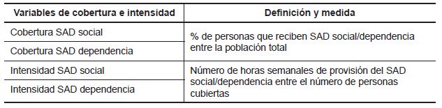 A partir de estos datos, se define la cobertura del servicio como el porcentaje de la población diana que recibe el SAD, estableciendo como población diana la población total de Catalunya ya que los dos tipos de SAD están disponibles para toda la ciudadanía. Adicionalmente, se analizan los datos para las personas mayores de 65 años (la ley establece una cobertura del 4 % para esta población). La intensidad del SAD se define como la media de horas semanales de las personas atendidas y se mide como la fracción de las horas totales entre el número de personas que reciben el SAD. De la misma forma, la medida es a escala de ABSS y se efectúan por parte del SAD social, el SAD dependencia y la suma de los dos SAD.