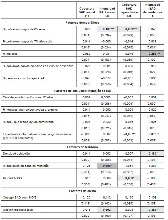 La Tabla 2 nos muestra que tanto las variables de oferta como de demanda son relevantes a la hora de explicar la variabilidad. Por la parte de la demanda, los factores de más relevancia son el porcentaje de población mayor de 65 años y el porcentaje de mujeres. Un aumento de un 1 % del porcentaje de población mayor de 65 años está relacionado con un aumento de la cobertura del SAD dependencia del 8 %, aunque no afecta particularmente la cobertura del SAD social, pero sí a su intensidad ya que un aumento del 1 % de este colectivo está asociado a un aumento de 0,10 horas de atención (unos 6 minutos).