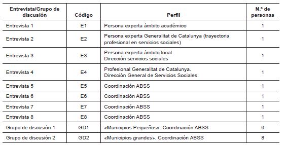 En la tabla a continuación se muestran los perfiles de las persones entrevistadas y los grupos de discusión así como el código de las citas incorporadas en el artículo.