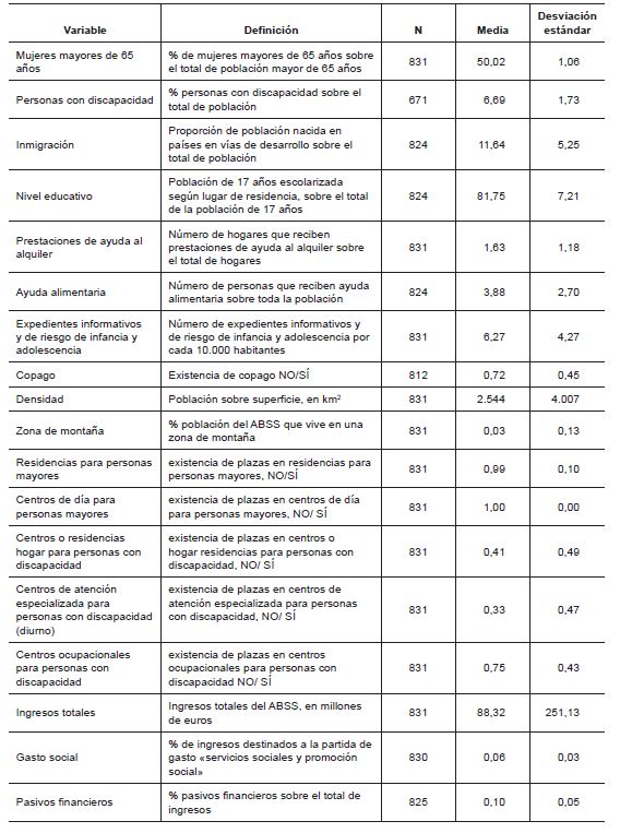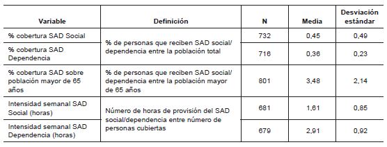 Respecto a los factores de provisión se han incluido variables como la existencia de copago o el tipo de gestión, directa o indirecta, que pueden afectar a la demanda tanto del SAD social como del SAD dependencia. Así mismo, se han tenido en cuenta otros factores de provisión como son las alternativas al SAD, incluyendo la oferta de recursos para personas mayores y personas con discapacidad o diversidad funcional. Así, se incorporan indicadores sobre la existencia de plazas y el porcentaje sobre población mayor o con discapacidad en residencias y centros de día, residencias y centros de atención especializada y centros ocupacionales para personas con discapacidad. Por último, se ha considerado la situación financiera de la entidad local con tres variables que se agregan a nivel anual de ABSS: los ingresos totales, el gasto total calculado como el porcentaje de ingresos destinados a la partida de gasto «servicios sociales y promoción social» y la situación de los pasivos financieros.
