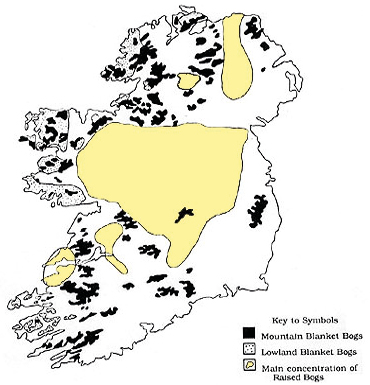 Peatlands are carbon sinks and have a role to play in sequestering and storing CO2 as protection against climate change (Fluet-Chouinard et al., 2023). When degraded and drained the peatlands become a source of greenhouse gas emissions and biodiversity is damaged. It is now acknowledged that Ireland’s peatlands are currently a large net source of carbon emissions, and they continue to be spoiled due to land drainage for agricultural purposes, afforestation, and peat extraction (Houses of the Oireachtas, 2019). This is despite the evidence that climate change and the biodiversity crisis are closely interlinked and solutions like peatland rewetting are considered “low hanging fruit” in terms of viable options for mitigating climate change (O’Connell et al., 2021). The evidence presents a depressing picture of the state of Ireland’s peatlands but there are shifts towards conservation and restoration. Between 1997 and 2002, Ireland nominated fifty-one raised bog sites for designation as Special Areas of Conservation (SACs). Seventy-five raised bog Natural Heritage Areas (NHAs) were also designated to support the network. To augment these actions government policy and EU sponsored restoration projects, such as the Living Bog Project funded by the EU LIFE programme and launched in 2016, aim to reverse peatland losses through sustainable management and rehabilitation (Stout & Ó’Cinnéide, 2021). Further, the cutting of peat in Ireland’s active raised bog network was officially banned in 2011 to safeguard –somewhat late– internationally important sites listed as priority habitat for protection under EU law. The state acquisition of raised bogs is regarded as a potential solution since these habitats don’t require grazing regimes (Craig, 2001, p. 148) and this is perceived as better value for money as opposed to compensating landowners (Renou-Wilson et al., 2011). Figure 1illustrates the principal locations of Ireland’s raised bogs.