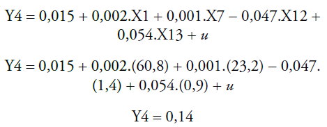 De acordo com as análises que resultaram nas equações de regressão para previsão do comportamento dos custos para cada item de custos, apresenta-se a equação que representa o modelo. Neste caso, utiliza-se a equação da variável independente Y4 (Despesas financeiras). Para demonstrar a aplicabilidade do modelo, substituem-se as variáveis independentes por valores reais da empresa Cambuci no trimestre 12/2013: