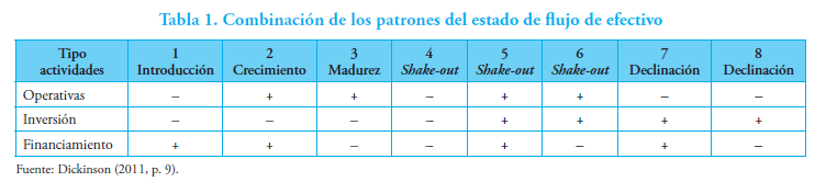 Livnat y Zarowin (1990) y Kusuma (2014) encuentran que las partidas del estado de flujo de efectivo están asociadas diferencialmente con el retorno de las acciones, de lo cual se infiere que los flujos de efectivo capturan la heterogeneidad en la rentabilidad, el crecimiento y el riesgo (Dickinson, 2011). Los patrones del estado de flujo de efectivo son mapeados con la teoría del ciclo de vida, de la cual se deriva la aplicación práctica de la clasificación de las etapas del ciclo de vida, expuesta en la Tabla 1. Las etapas definidas por Dickinson (2001) están basadas en las cinco etapas propuestas por Gort y Kepler (1982): introducción, crecimiento, madurez, shake-out (reestructuración) y declinación.