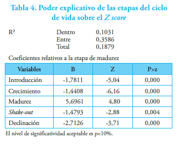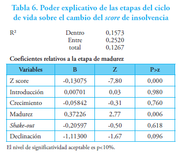 Por otra parte, las etapas del ciclo de vida tienen una capacidad predictiva sobre el cambio del riesgo de insolvencia en el año siguiente. El Z score muestra un proceso de reversión a un determinado valor, y, adicionalmente, la etapa de madurez tiene un efecto positivo, mientras que la etapa de declinación, un efecto negativo. Asimismo, cabe anotar que no se concluye que las empresas en la etapa de introducción tengan un mayor riesgo de insolvencia. En la trayectoria de las empresas en los cinco años anteriores a la formación de un portafolio por etapas del ciclo de vida, aquellas que se mantienen en la etapa de madurez tienen una mayor posibilidad de mantenerse en dicha etapa. Por su parte, las empresas en las etapas de crecimiento y shake-out tienen una mayor posibilidad de entrar en la etapa de introducción y declinación que las empresas en la etapa de madurez. Para finalizar, es preciso anotar que el análisis de las empresas por las etapas debería complementarse con el análisis del resto de los ratios que han evidenciado capacidad predictiva de la crisis financiera, en razón de que el ciclo de vida provee un análisis contextual.