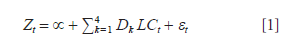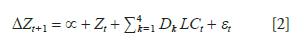LCt: Variable dicotómica indicativa de la etapa del ciclo de vida de la empresa, en la que 1 corresponde a si la empresa pertenece a dicha etapa y cero, en caso contrario, en el período t. La etapa restante es capturada por la ordenada de origen.