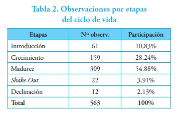 Las observaciones (empresas-año) distribuidas por etapa del ciclo de vida se muestran en la Tabla 2. Las etapas, clasificadas por patrones del estado de flujo de efectivo, tienen una distribución bastante desigual: la mayor participación corresponde a la etapa madurez (54,88%); y la menor participación, a las etapas shake-out (3,91%) y declinación (2,13%), mientras que las etapas de introducción (10,83%) y crecimiento (28,24%) ocupan un lugar intermedio.