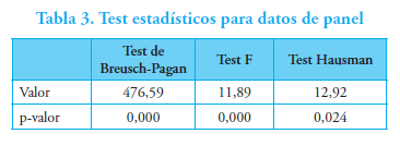 El primer lugar, en el caso de datos longitudinales, corresponde determinar si el modelo más apropiado es el de datos agrupados o el modelo de datos de panel con efectos fijos o aleatorios; la Tabla 3 muestra los resultados de los test estadísticos. Tanto el test de Breusch-Pagan como la prueba F rechazan la hipótesis Ho, por lo cual los modelos de datos de panel son más adecuados que el modelo de datos agrupados. En segundo lugar, según la prueba de Hausman, se rechaza Ho de igualdad de las estimaciones: las diferencias de los parámetros son sistemáticamente significativas; por lo tanto, es más consistente el modelo con efectos fijos.