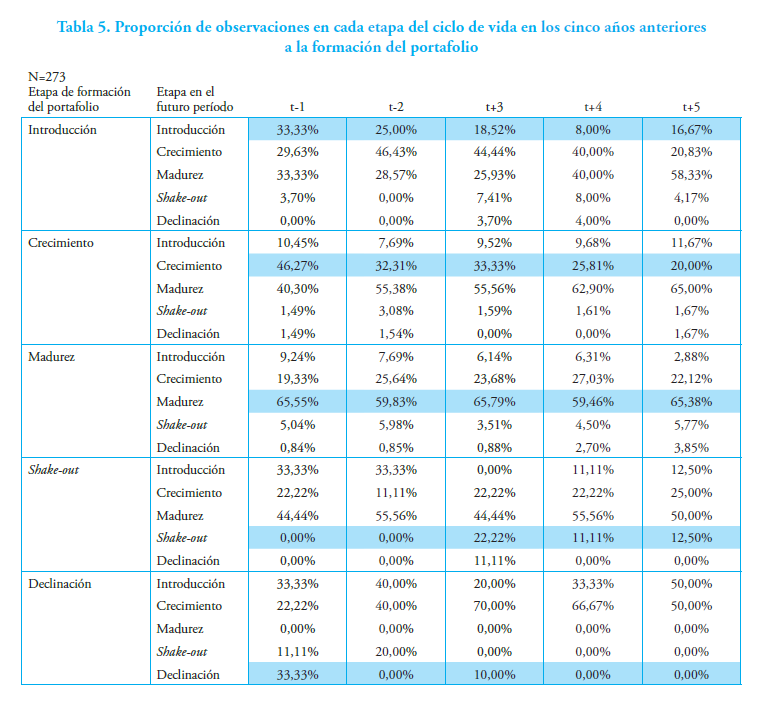 Entonces, en razón de la existencia de un efecto importante de las etapas del ciclo de vida sobre el Z score de insolvencia, la Tabla 5 muestra la evolución en los cinco años anteriores, a partir de la formación de un portafolio inicial por etapa de ciclo de vida. En la etapa de introducción, en el primer año anterior, la mayor proporción corresponde a las etapas de introducción y madurez; desde el segundo al cuarto, la mayor proporción corresponde a la etapa de crecimiento; y, en el quinto año anterior, a la etapa de madurez. En la etapa de crecimiento, en el primer año anterior, la mayor proporción pertenece a la etapa de crecimiento y madurez; en el resto de los períodos, a la etapa de madurez y crecimiento (la primera de manera ascendente y la segunda descendente).