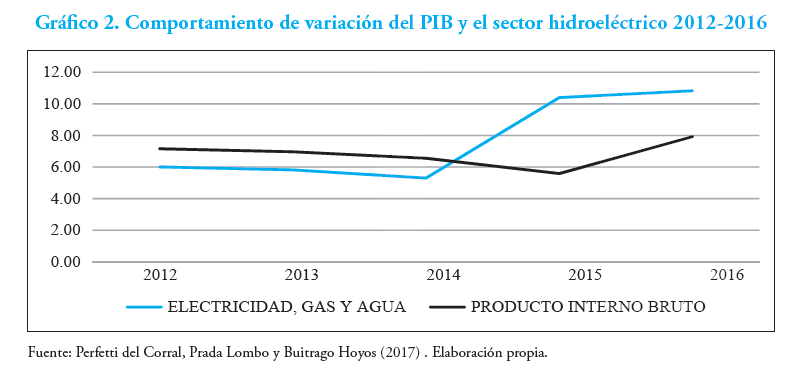 La relevancia del sector hidroeléctrico como motor del desarrollo económico en Colombia se ve reflejada al observar el PIB, que, de 2006 a 2009, fue de 9,7%;durante el período 2010 a 2013, de 11,2%; y de 2014 a 2016, de 13,43%, con lo cual se evidencia que ha sido el desarrollo del sector. Esto, en parte, se debe a los flujos de inversión extranjera directa, los que, para 2018, crecerán a una escala del 46%, de acuerdo con el Plan de Desarrollos de 2014 a 2018 (Departamento Nacional de Planeación, 2014).