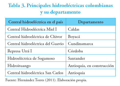 A continuación, en la tabla 3, se mencionan las principales hidroeléctricas colombianas y dónde se encuentran ubicadas.