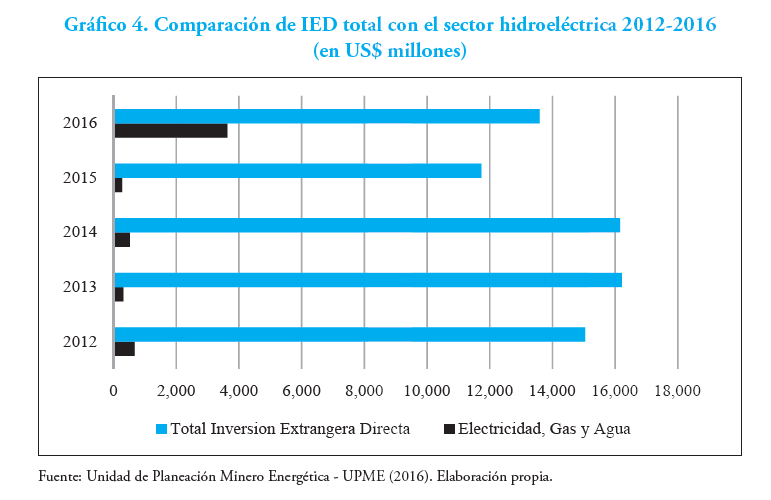 Las consecuencias del ingreso de las multinacionales pueden ser directas o indirectas; dichas multinacionales afectan a muchas empresas de diversos sectores de la economía colombiana. La inversión en su totalidad y el tipo de la misma son factores de importancia al momento de considerar la relevancia que la inversión tiene para la economía. En el año 2016, la inversión extranjera directa en Colombia ascendió a US$ 13 593, un 15,86% más que durante el año anterior; por el contario, en el sector hidroeléctrico, durante 2016, dicha inversión correspondió a US$ 1914, lo que representa un -22,54%, en comparación con el año anterior. A continuación, en el gráfico 4, se presenta la comparación entre el total de flujo de inversión extranjera directa, y la inversión del sector hidroeléctrico entre 2012 y 2016.