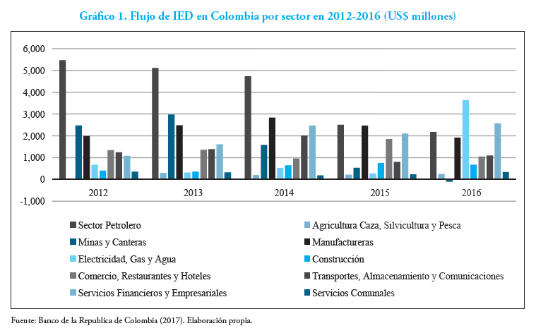 A continuación, se mostrará el gráfico 1, en el cual se evidencia el valor de la inversión extranjera desde 2012 a 2016 y a qué sector de la economía pertenece. De esta manera, es posible ampliar la aproximación a lo que ha sucedido en Colombia durante ese período.