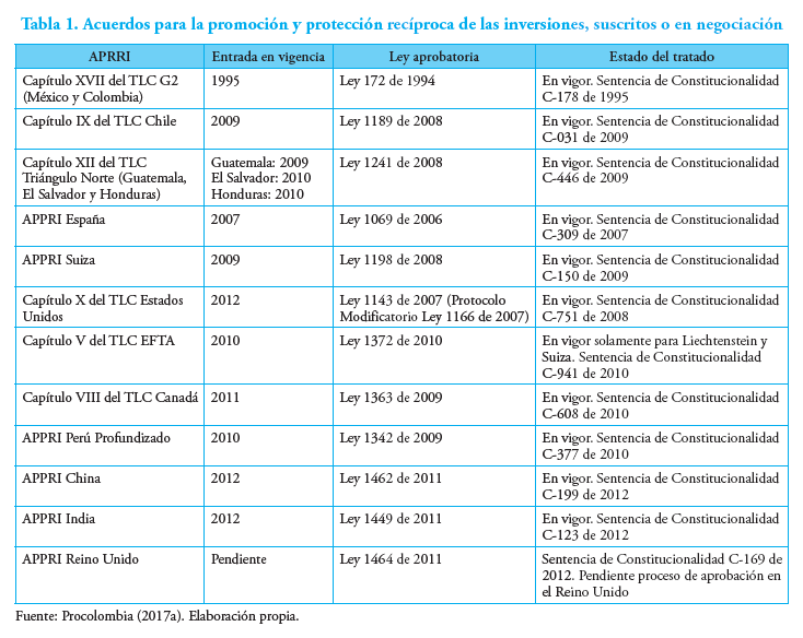 Este tipo de políticas de comercio exterior permiten el desarrollo de una integración económica, que se encuentran definidos en los últimos tres planes nacionales de desarrollo. Estos son los cambios que han sido necesarios realizar para hacer de la economía colombiana una economía más abierta a la globalización que exige el mercado mundial (Gutiérrez Haces y Quintero, 2016). La tabla 1 muestra los acuerdos vigentes en los que Colombia ha participado para la promoción y la protección recíproca de las inversiones, suscritos o en negociación (Gazol Sánchez, 2016).