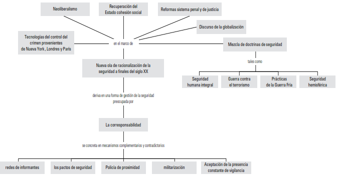A finales del siglo XX, se empieza a dar una nueva ‘ola de racionalización’ sobre la seguridad, que se caracteriza por un involucramiento más directo de alcaldes en la coordinación de estrategias para combatir la delincuencia y la transformación de normas de conducta entre los ciudadanos. Pero, además, se sostuvo que en este periodo se da una conjunción de doctrinas de seguridad —seguridad humana, seguridad hemisférica, seguridad nacional, guerra contra el terrorismo— paralelo a reformas judiciales, la instalación del neoliberalismo y de una planeación impregnada del discurso de la ciudad global. En este ‘régimen de seguridad’ se estableció como principio fundamental la corresponsabilidad de las personas con las autoridades policiales y militares en la producción (o coproducción) de seguridad.