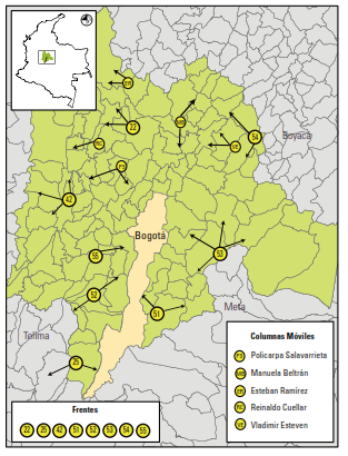 Este es un proceso de expansión sobre Bogotá que correspondió al plan de urbanizar el conflicto que las FARC definieron en su Séptima Conferencia en 1982 y que detallaron estratégicamente en su Octava Conferencia de 1985 (Vélez 2001, 163). Desde comienzos de la década de los noventa se puso en marcha este plan que consistió en posicionar frentes guerrilleros en Cundinamarca, la formación de las milicias urbanas bolivarianas en lugares como Bosa, Ciudad Bolívar, Soacha, Patio Bonito y Suba, así como la realización de ataques en los municipios del área metropolitana de Bogotá (Vélez 2001, 166). Sin embargo, en el contexto de las fracasadas conversaciones de paz durante la presidencia de Andrés Pastrana (1998–2002), las farcliteralmente capitalizaron su proyecto de expansión territorial, posicionándose sobre zonas metropolitanas de las principales ciudades, entre estas, la zona metropolitana de Bogotá (figura 2)20