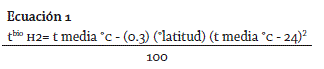 Una vez completada la serie de precipitación y temperatura se procedió al cálculo de la razón de aridez anual. Esta última mide el estrés hídrico del medio ambiente. Hay varias razones disponibles, pero para efectos del presente estudio se calculó una siguiendo a Thaiutsa y Granger (2015), que es la razón de la evapotranspiración potencial —en adelante, ETP— sobre la precipitación. Esto quiere decir que a mayores niveles de la razón de aridez, mayor estrés hídrico. La ETP fue acuñada por Thornthwaite (1948) como la máxima cantidad de agua que puede evaporarse desde un suelo completamente cubierto de vegetación. Holdridge (1967) introdujo el concepto de biotemperatura por vez primera con miras a extrapolarlo a distintas latitudes, con los parámetros que esta contaba por debajo del punto de congelación y por encima de los 30 °C. Toda vez que no hay temperaturas de 0 °C o inferiores, como es el caso de Providencia, la temperatura media anual es equiparable con la biotemperatura “tbioh1”. Holdridge (1987) introdujo una modificación para el cálculo de la biotemperatura con la siguiente fórmula (el H2 es introducido por los autores para distinguir la biotemperatura H1):
