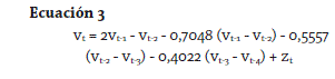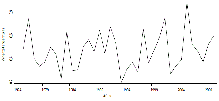 La varianza de la temperatura, al igual que la precipitación, exhibe una tendencia asociada a un modelo ARI de parámetros (3,1) (figura 4). En otras palabras, la variación en la temperatura está aumentando. Cabe destacar que el parámetro que determina la no estacionalidad en un modelo ARIMA (p, d, q) es el parámetro d, el cual determina el orden de las diferencias que deben ser aplicadas para volver estacionaria la serie. En ambos casos (varianza de temperatura y varianza de precipitación) este parámetro es 1, lo cual indica que una diferenciación de primer orden debe ser aplicada a la serie para volverla estacionaria, señalando así la tendencia creciente de la serie, tabla 1.