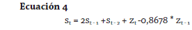 Finalmente, el análisis de la serie anual de la razón de aridez H1 sugiere (Mann–Kendall: p–valor de 0,376; Dickey–Fuller: p–valor = 0,867) que hay tendencia negativa, esto es, que la razón de aridez ha ido disminuyendo (tabla 1 y figura 5). Enseguida se ajusta un modelo IMA (1,1) que cumple con todos los supuestos del modelo. El modelo ajustado es el siguiente: sea St la razón de aridez en el año t y sea Zt una variable aleatoria distribuida n (0, sigma). Entonces: