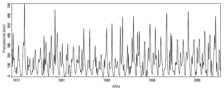A pesar de la imputación de los datos no fue posible un pleno ajuste de un modelo ARIMA a la serie de precipitación media mensual ya que los residuales del modelo nunca cumplieron los supuestos de este, sobre todo las pruebas de normalidad fueron sistemáticamente rechazadas. A primera vista, la serie de precipitación media mensual parece ser estacional (figura 1). Al realizar la prueba de Mann–Kendall se obtuvo un p–valor de 0,22395, con lo cual no se puede rechazar la hipótesis nula, en este caso, se acepta que la serie de precipitación es estacionaria. En otras palabras, no puede aceptarse la hipótesis alterna de una tendencia en cuanto a la precipitación media mensual. Adicionalmente, la prueba de raíz unitaria aumentada de Dickey–Fuller arrojó un p–valor menor a 0,01, por lo tanto, se rechaza la hipótesis nula de presencia de raíz unitaria, es decir, la serie es estacionaria, lo que confirma el resultado de la prueba anterior. En el caso de las subseries de precipitación, la prueba de Mann–Kendall nunca fue rechazada, mientras que la de Dickey–Fuller fue aceptada (p–valor de 0,0636) desde noviembre del 2008 y mostró una tendencia positiva.